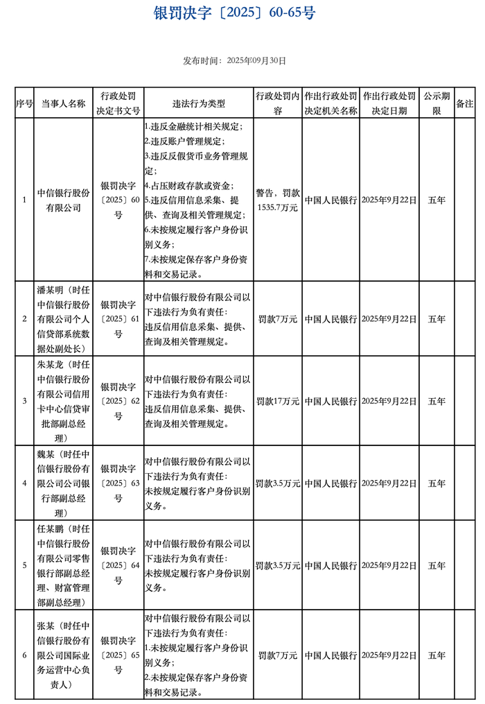 时任中信银行股份有限公司个人信贷部系统数据处副处长潘某明等五人被罚款合计38万元。