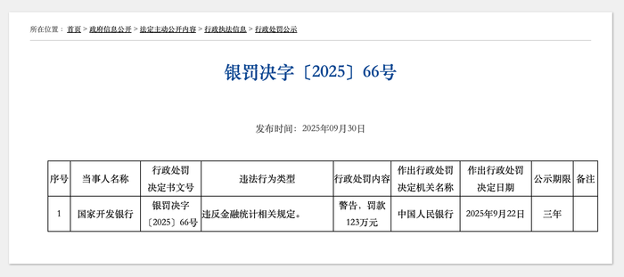 乐动·LDSports9月30日,央行行政处罚公示信息显示,国家开发银行因违反金融统计相关规定被警告,并被罚款123万元。